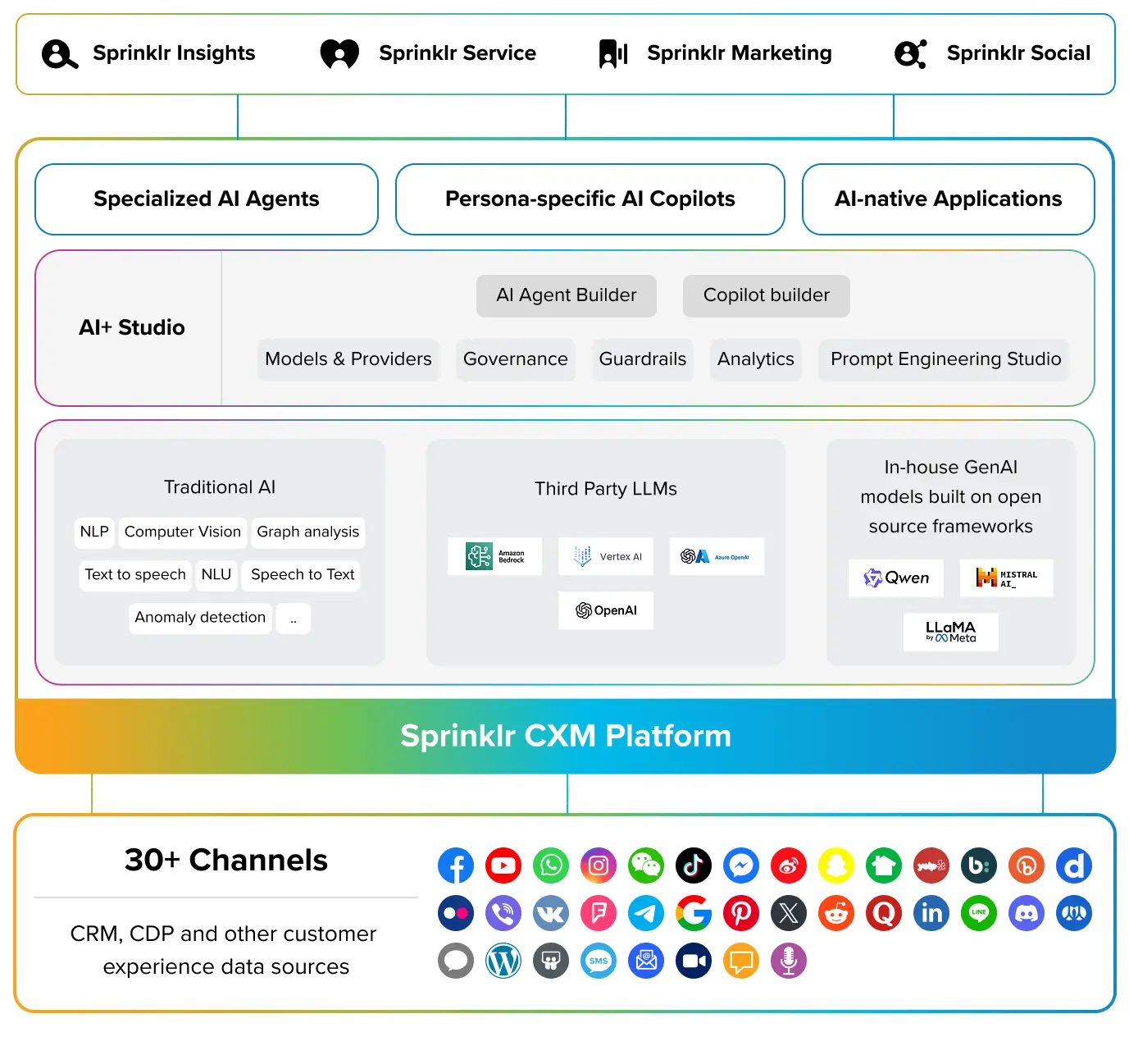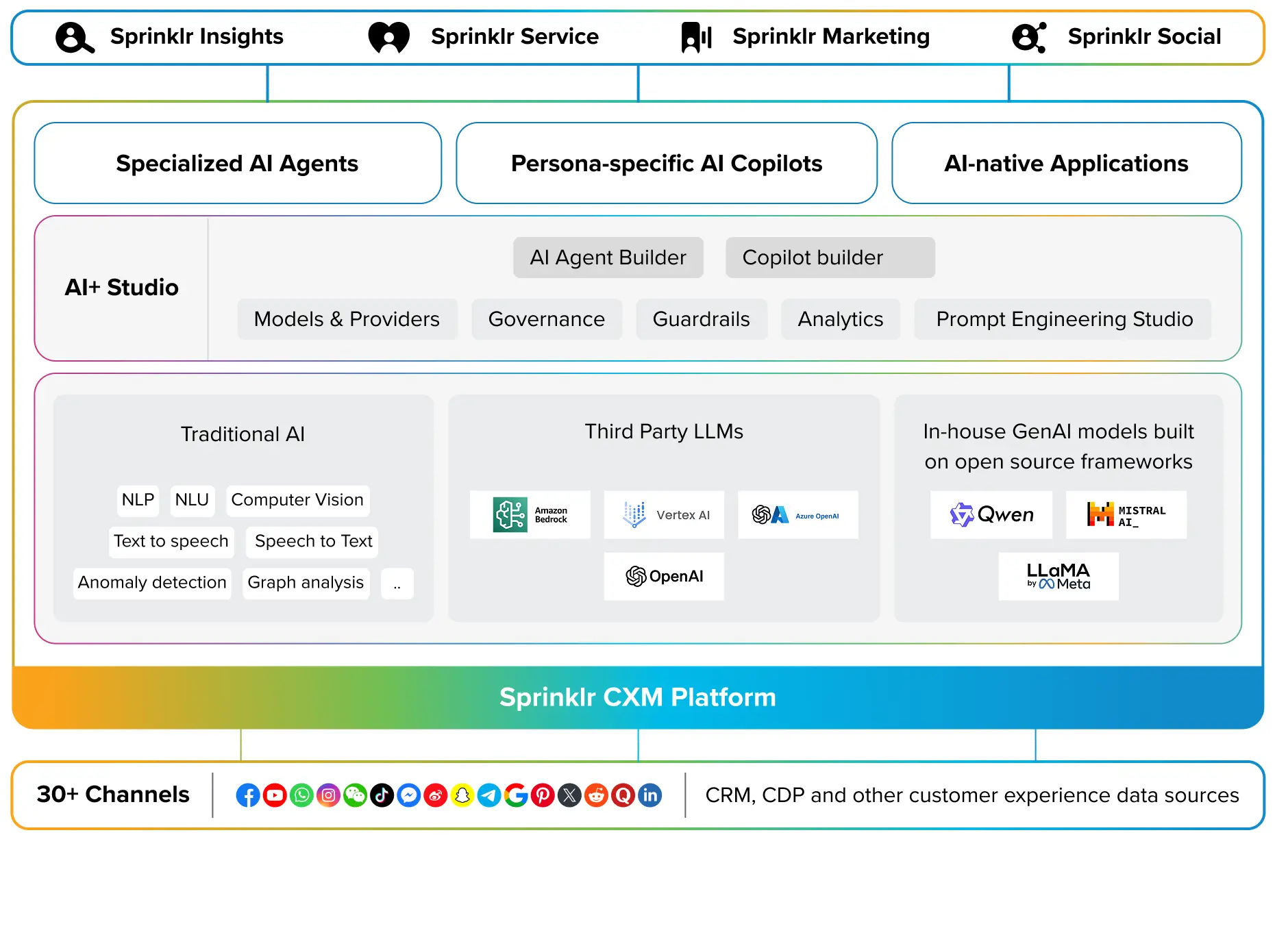 AI is natively infused across the Sprinklr platform, delivering accurate and trusted results through a seamless blend of proprietary innovation and best-in-class third-party capabilities.