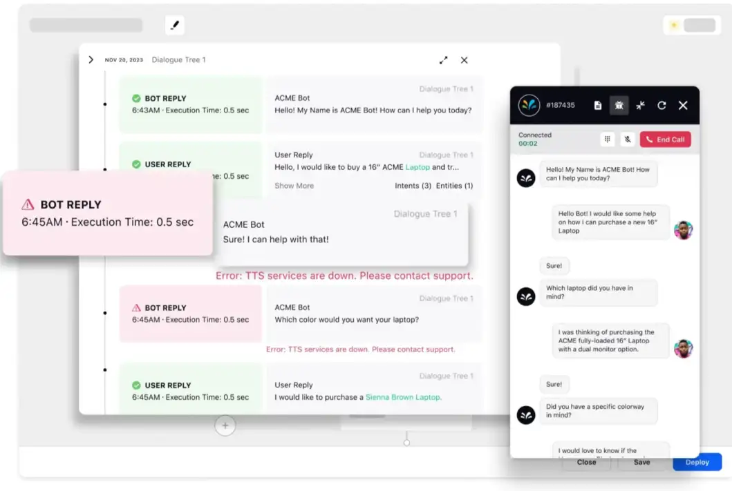 Test across all platforms where the bot will be deployed — website, app, messaging channels — and ensure consistent behavior and experience across the board. If your bot integrates with backend systems like CRM or order management tools, verify how it behaves when these systems are slow or fail.