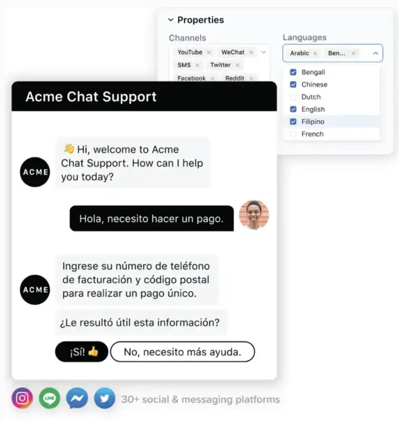 Today’s customers don’t stick to one channel, nor should your customer service chatbot. Whether it’s your website, mobile app, WhatsApp, Instagram, SMS, or live chat widget, modern customer service chatbots deliver a unified experience across channels, maintaining context and conversation history throughout.