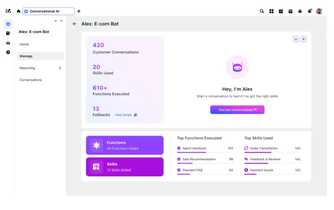 Modern bots get smarter over time. With built-in machine learning and performance analytics, they constantly evolve based on customer feedback, escalation rates and success outcomes —turning every conversation into a learning opportunity.