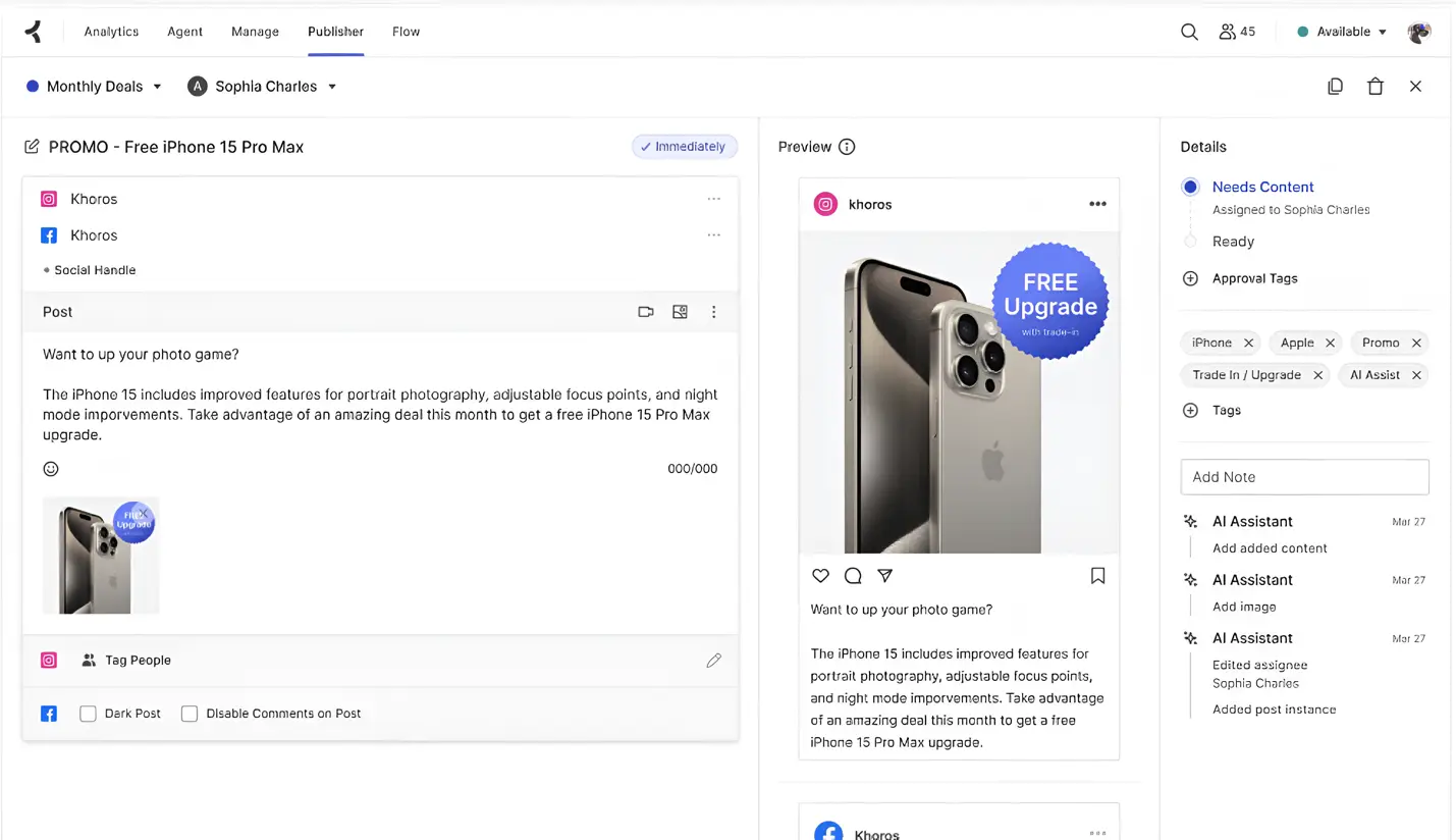 2. Advanced AI capabilities: While Khoros has basic AI capabilities that only scratch the surface of automation, Sprinklr’s AI engine transforms how brands manage social — to streamline publishing, engagement and compliance, ensuring seamless social media operations.
