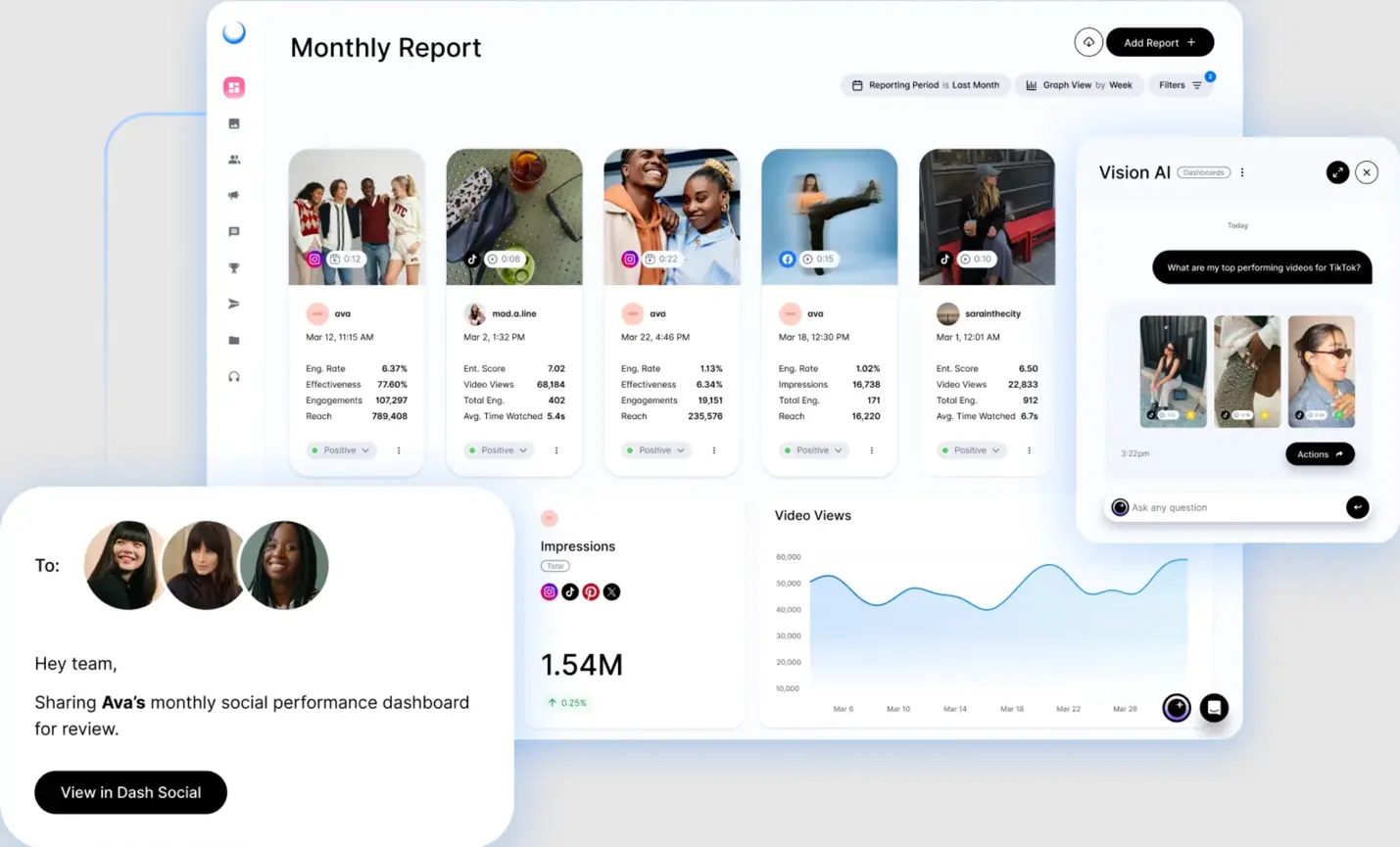 Dash Social excels in AI-driven content optimization and trend analysis, making it a powerful alternative to Khoros for brands focused on visual storytelling and predictive insights. With features like Vision AI, advanced social listening and customizable analytics, it offers a data-rich, engagement-driven approach to social media management.