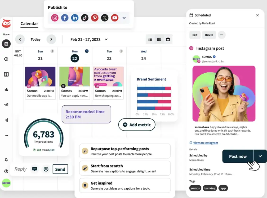 - Hootsuite’s AI-powered writing tool, OwlyWriter AI, helps users generate captions, repurpose top-performing posts and create engaging content quickly, reducing the time spent on social copy.