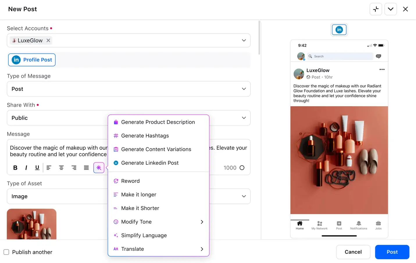 - Its AI assistant generates content ideas, suggests improvements and helps repurpose existing posts, boosting productivity while ensuring a consistent brand voice.