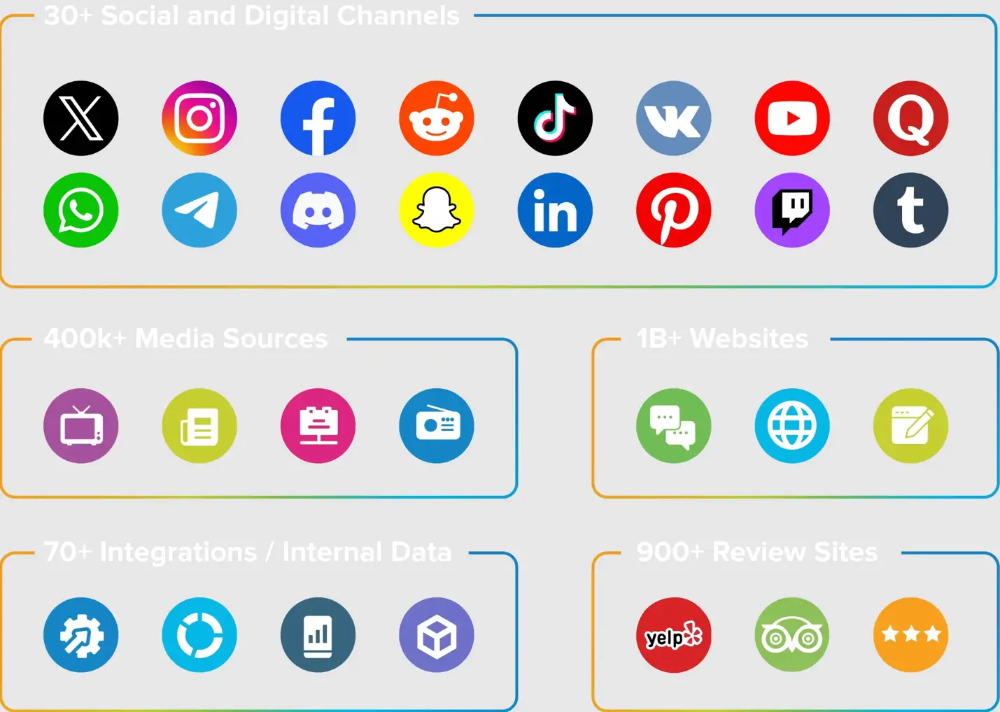 Sprinklr Insights gives enterprises a complete view of their brand, customers and competition. It combines powerful social listening with AI-driven customer feedback management and competitive benchmarking at scale. Track conversations across 30+ social and digital platforms, hundreds of thousands of media outlets and over a billion websites. Go beyond text with the ability to analyze images, videos, and multimedia mentions for a richer picture of brand perception.