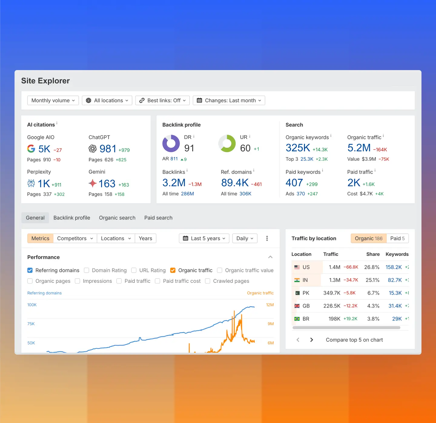 - Competitor benchmarking: See which keywords, content, and backlinks drive traffic to competitor sites, helping you figure out gaps and opportunities.