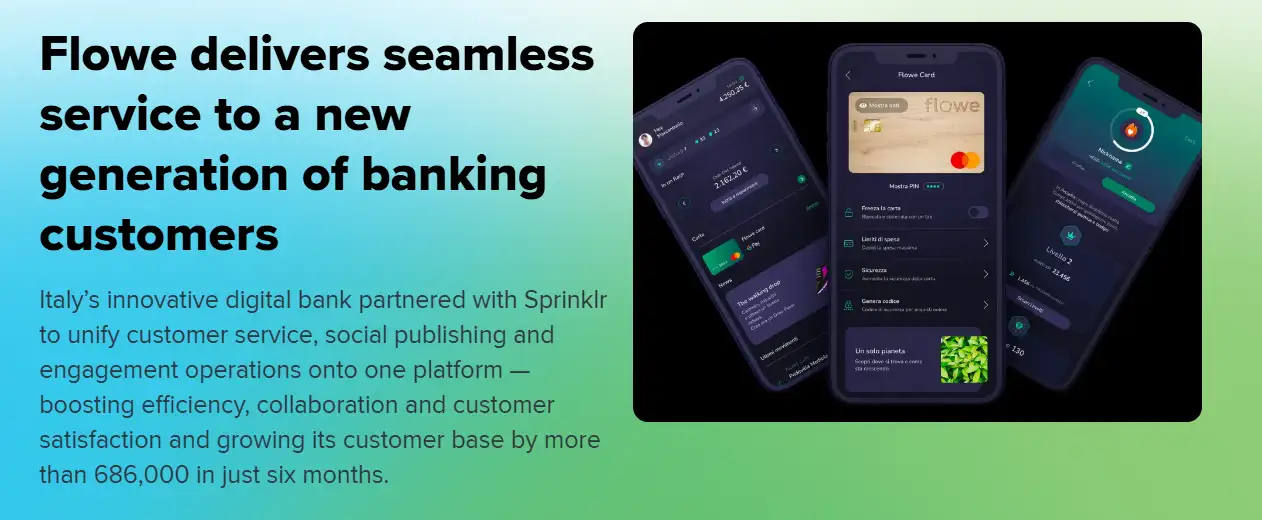 Success story: Flowe, Italy’s renowned digital bank used Sprinklr to unify its messaging across marketing, engagement and support to scale its growth by 67% within the first year of deployment.