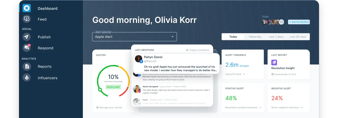 - Competitive context: Side-by-side comparison of mention volume and sentiment against key competitors helps you understand your relative position in the market conversation.