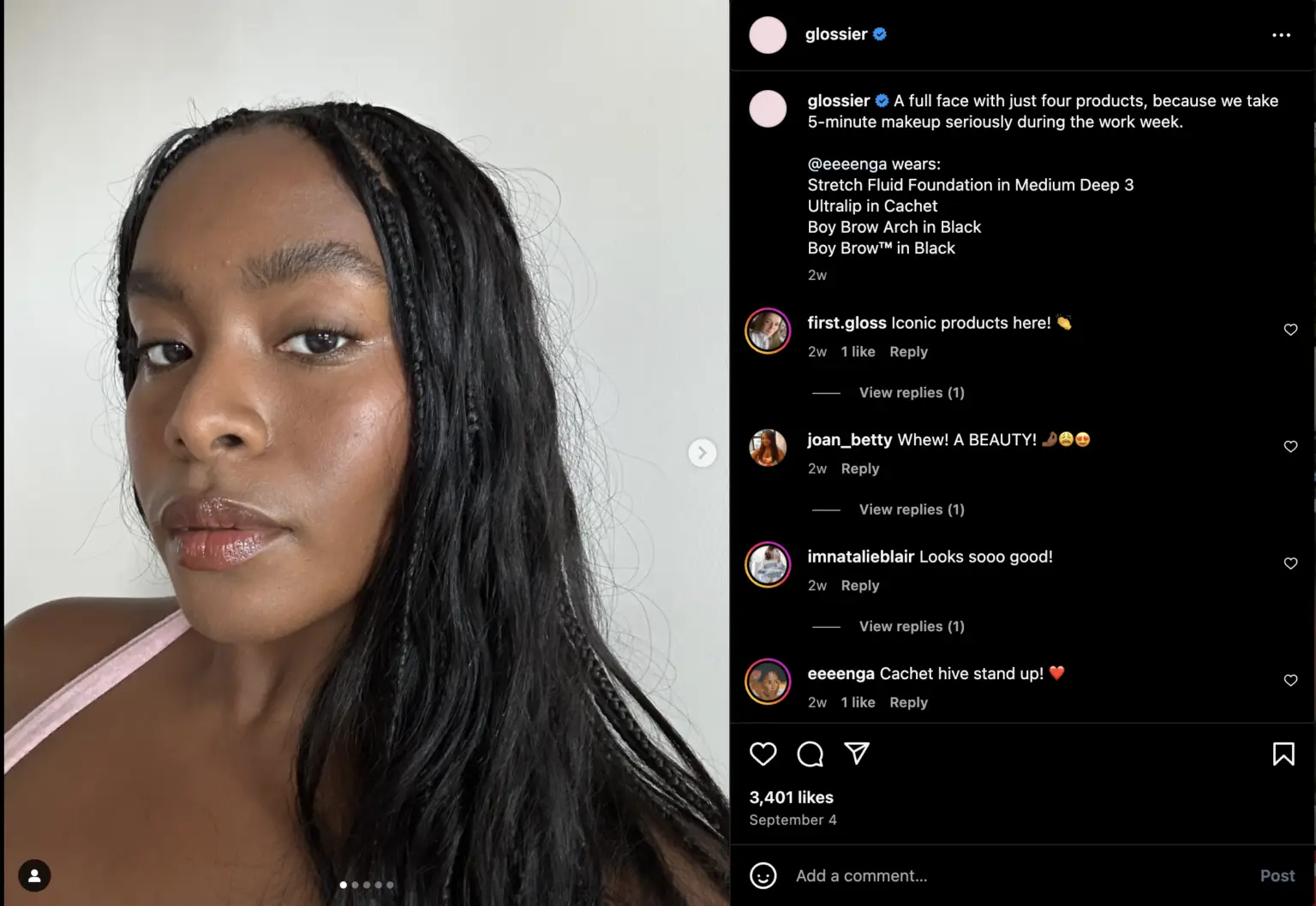 Pro tip: Learn how to use hashtags effectively and encourage customers and followers to append branded hashtags in relevant posts, which helps expand your reach further. Check how cosmetics brand Glossier aces the hashtag trend.