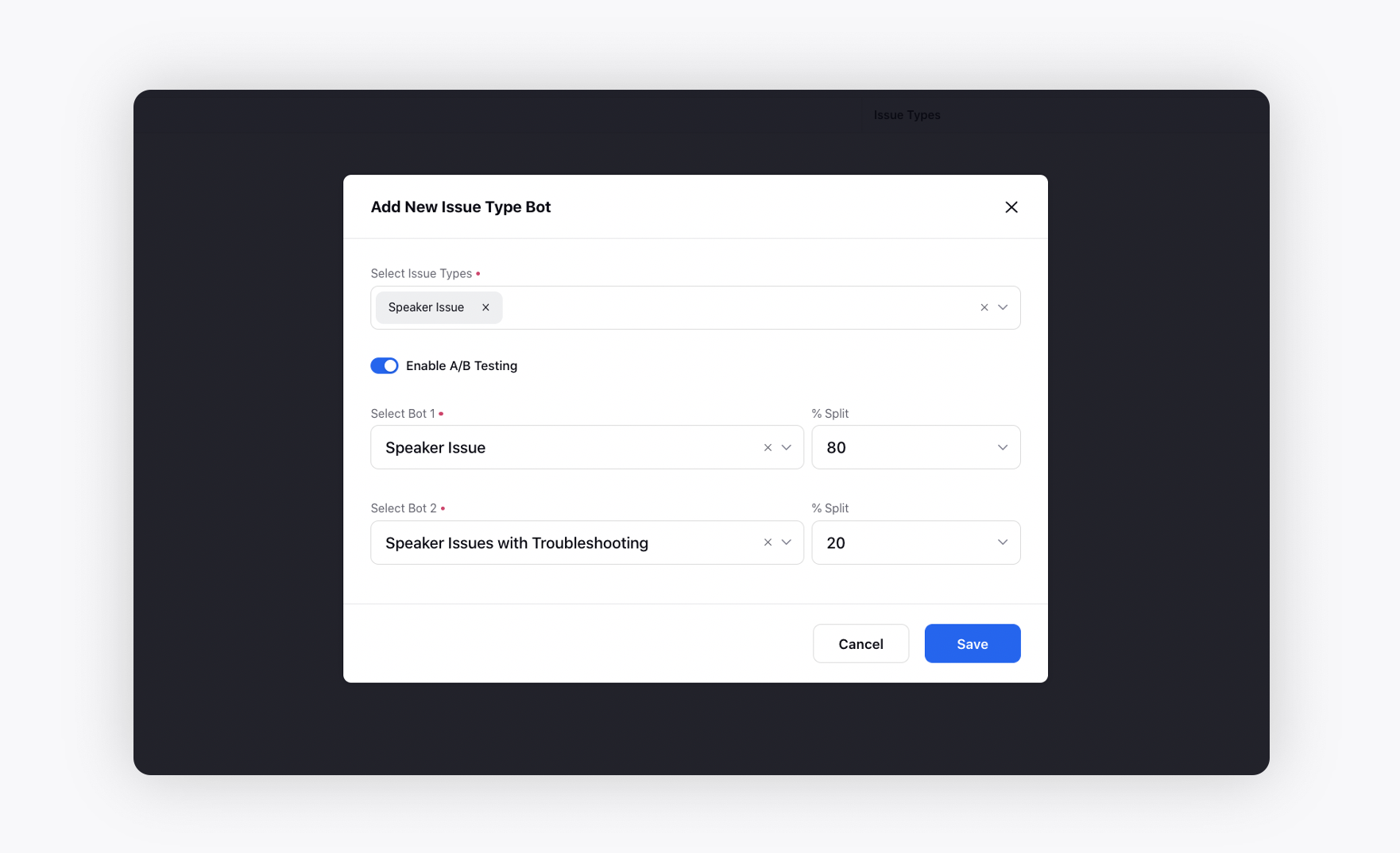 Enable A/B Testing: Within the Deployment Settings, you have the option to enable A/B testing for qualifying and issue type bots.