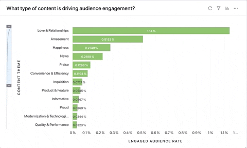 AI automatically classifies brand posts into categories to help you understand which message themes, tones and objectives are driving the most engagement. For example, if you are posting motivational content with a low engagement rate but your product tips are getting a lot of engagement, you can adjust your strategy accordingly.