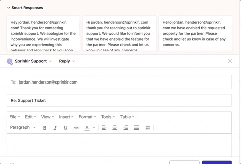 Smart Response Recommendations in Sprinklr Modern Care: Customer care agents no longer have to search for a reply script and manually respond to every single query. Smart Response Recommendations reads the ongoing conversation with the customer and then offers the agent three suggested responses. These suggestions include text, relevant emojis, and brand approved assets. Agents can then use the response directly or edit it before sending it out. This saves agents a tremendous amount of time by eliminating the need to manually type responses every time a customer asks a question. With Sprinklr Smart Response Beta customers, the recommended response is used by agents 60 percent of the time, which has reduced customer support SLA (Service Level Agreement) time by 33 percent. Additionally, Smart Response Recommendations help brands onboard agents faster by eliminating the additional training typically needed for standard manual responses.