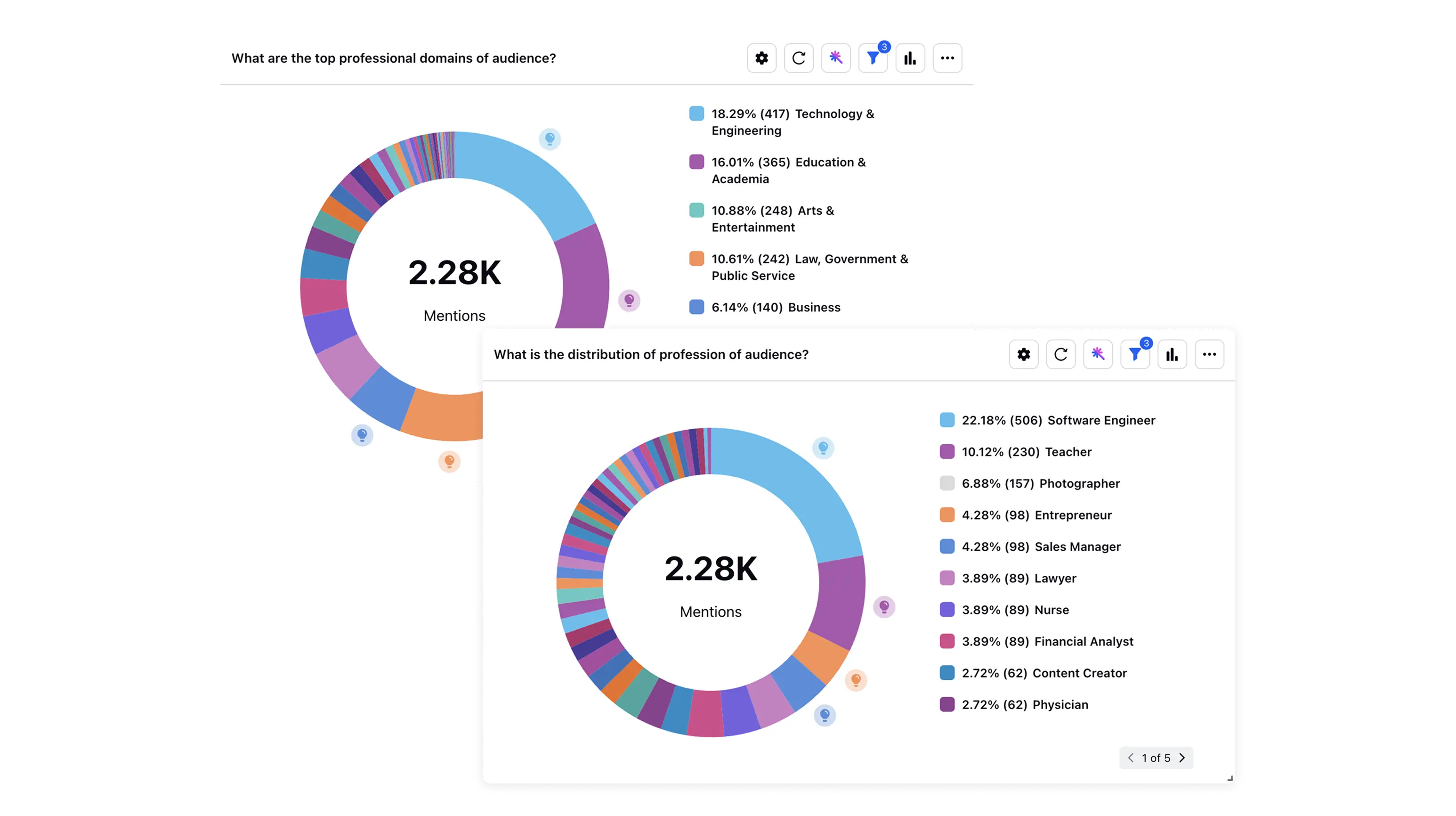 Gain deeper insights into how professionals across industries perceive your brand and products. Gain deeper insights into how professionals across industries perceive your brand and products. Create audience groups by profession to craft targeted campaigns and identify key influencers within your targeted professional domain.