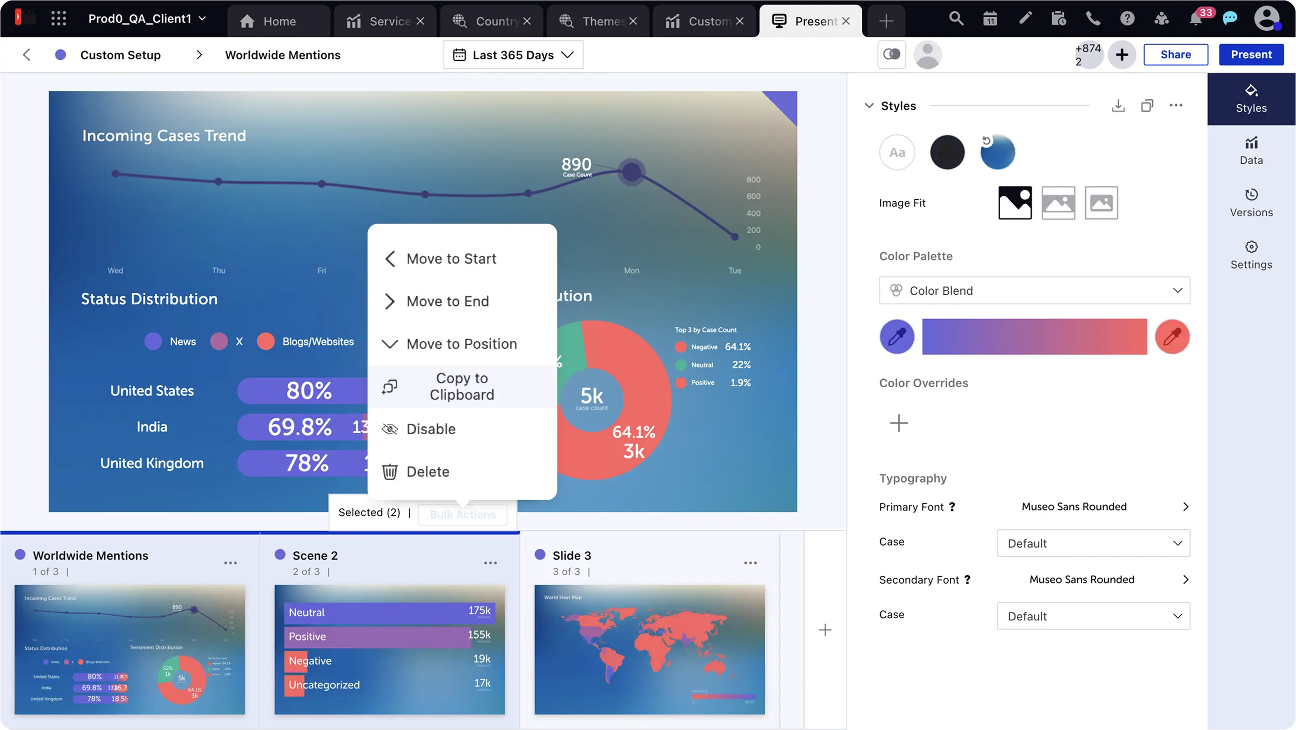 Save time with new bulk actions in Sprinklr Displays and Presentations. Move, copy, delete, or enable/disable multiple scenes at once, ensuring seamless organization across presentations. Widgets can also be copied or aligned in bulk, making layout management consistent and easier, reducing repetitive tasks.